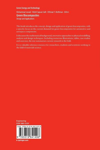 This book introduces the concept, design and application of green biocomposites, with a specific focus on the current demand for green biocomposites for automotive and aerospace components. It discusses the mathematical background, innovative approaches to physical modelling, analysis and design techniques. Including numerous illustrations, tables, case studies and exercises, the text summarises current research in the field. It is a valuable reference resource for researchers, students and scientists working in the field of materials science.