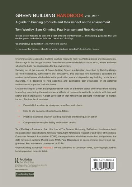 Environmentally responsible building involves resolving many conflicting issues and requirements. Each stage in the design process from the fundamental decisions about what, where and even whether to build has implications for the environment. Evolving out of the success of Green Building Digest, a publication described by Building Design as well-researched, authoritative and exhaustive, this practical new handbook considers the environmental issues which relate to the production, use and disposal of key building products and materials. It is designed to help specifiers and purchasers gain awareness of the potential environmental impact of their decisions. Chapter by chapter Green Building Handbook looks at a different sector of the trade from flooring to roofing, comparing the environmental effects of commonly available products with less well known green alternatives. A Best Buy section then ranks these products from lowest to highest impact.