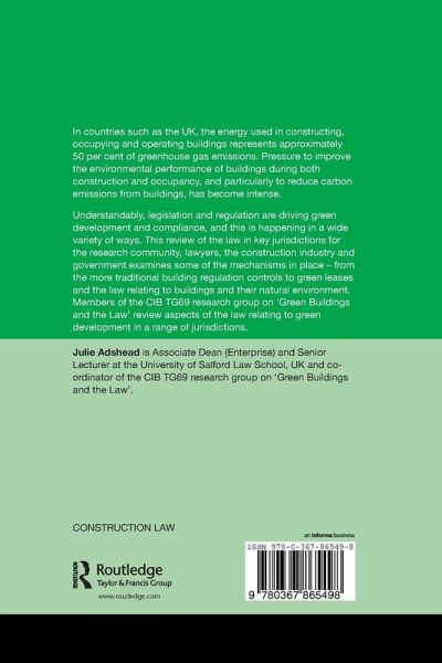 In countries such as the UK, the energy used in constructing, occupying and operating buildings represents approximately fifty percent of greenhouse gas emissions. Pressure to improve the environmental performance of buildings during both construction and occupancy, particularly to reduce carbon emissions from buildings, has become intense. Understandably, legislation and regulation are driving green development and compliance. And this is happening in a wide variety of ways. This review of the law in key jurisdictions for the research community, lawyers, the construction industry and government examines some of the mechanisms in place - from the more traditional building regulation controls to green leases and the law relating to buildings and their natural environment. Members of the CIB TG69 research group on 'Green Buildings and the Law' review aspects of the law relating to green development in a range of jurisdictions.