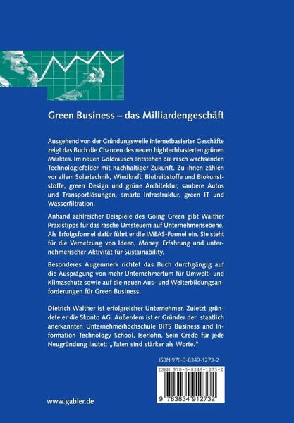 Anhand zahlreicher Beispiele des "Going Green" gibt WaltherPraxistipps für das rasche Umsteuern auf Unternehmensebene. Als Erfolgsformel dafür führt er die IMEAS-Formel ein. Sie steht für die Vernetzung von Ideen, Money, Erfahrung und unternehmerischer Aktivität für Sustainability.