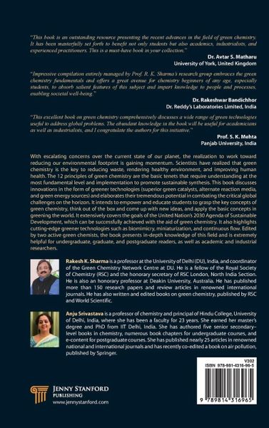 Rakesh K. Sharma is a professor at the University of Delhi (DU), India, and coordinator of the Green Chemistry Network Centre at DU. He is a fellow of the Royal Society of Chemistry (RSC) and the honorary secretary of RSC London, North India Section. He is also an honorary professor at Deakin University, Australia. He has published more than 150 research papers and review articles in renowned international journals. He has also written and edited books on green chemistry, published by RSC and World Scientific. Anju Srivastava is a professor of chemistry and principal of Hindu College, University of Delhi, India, where she has been a faculty for 23 years. She earned her master's degree and PhD from IIT Delhi, India. She has authored five senior secondary-level books in chemistry, numerous book chapters for undergraduate courses, and e-content for postgraduate courses. She has published nearly 25 articles in renowned national and international journals and has recently co-edited a book on air pollution, published by Springer.