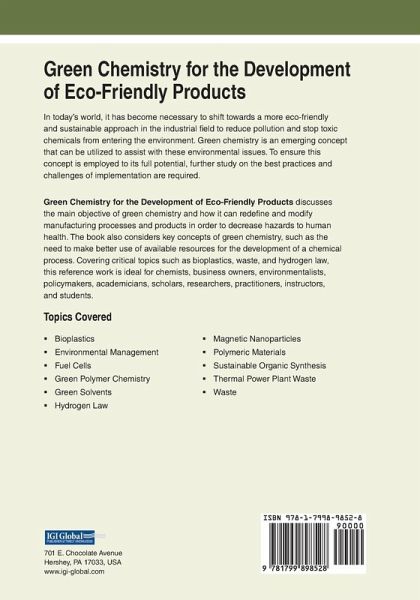 In today's world, it has become necessary to shift towards a more eco-friendly and sustainable approach in the industrial field to reduce pollution and stop toxic chemicals from entering the environment. Green chemistry is an emerging concept that can be utilized to assist with these environmental issues. To ensure this concept is employed to its full potential, further study on the best practices and challenges of implementation are required. Green Chemistry for the Development of Eco-Friendly Products discusses the main objective of green chemistry and how it can redefine and modify manufacturing processes and products in order to decrease hazards to human health. The book also considers key concepts of green chemistry, such as the need to make better use of available resources for the development of a chemical process. Covering critical topics such as bioplastics, waste, and hydrogen law, this reference work is ideal for chemists, business owners, environmentalists, policymakers, academicians, scholars, researchers, practitioners, instructors, and students.