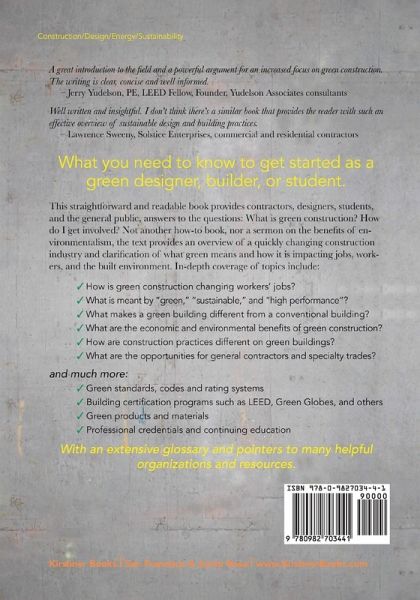 What green, sustainable, and high-performance means for the construction industry and its workers. Not another how-to book, nor a sermon on the benefits of environmentalism, the text provides an overview of a quickly changing construction industry and clarification of what green means and how it is impacting jobs, workers, and the built environment. In-depth coverage of topics include:What is meant by terms like green, sustainable, and high performance? What makes constructing a green building different from constructing conventional buildings? How is green construction changing workers jobs? What are the benefits, to jobs and the economy, as well as to the environment, of green construction? What are the challenges and opportunities for general contractors and specialty trades? Includes extensive coverage of:Green standards, codes, and rating systems Building certification programs such as LEED, Green Globes, and others Green products and materials Professional credentials and continuing education Extensive appendices include a history of the green movement; How we get and use our power; How to get a building LEED-certified; and an extensive list of helpful organizations and resources. A comprehensive glossary and detailed index complete the book. This book will be helpful to students, general contractors, tradespeople, designers, engineers, and the general public. Written by Alison Dykstra, AIA, CSI, author of the Construction Project Management: A Complete Introduction, and presented in an understandable way.