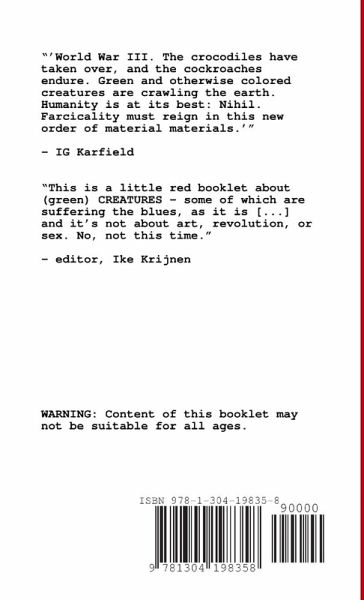 "(green) CREATURES" is a collection of rhymes and poems written by poet IG Karfield, about creatures from the known and the unknown world. If noticed at all, Mr. Karfield is it for his "sexxy, druggy, & rock 'n' rolly poetry" blogs, and those about art and revolution. But he takes a different turn in this little red booklet...