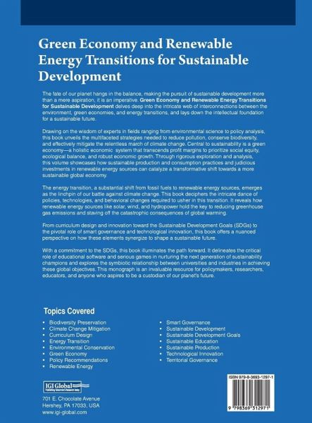 The fate of our planet hangs in the balance, making the pursuit of sustainable development more than a mere aspiration, it is an imperative. Green Economy and Renewable Energy Transitions for Sustainable Development delves deep into the intricate web of interconnections between the environment, green economies, and energy transitions, and lays down the intellectual foundation for a sustainable future. Drawing on the wisdom of experts in fields ranging from environmental science to policy analysis, this book unveils the multifaceted strategies needed to reduce pollution, conserve biodiversity, and effectively mitigate the relentless march of climate change. Central to sustainability is a green economy-a holistic economic system that transcends profit margins to prioritize social equity, ecological balance, and robust economic growth. Through rigorous exploration and analysis, this volume showcases how sustainable production and consumption practices and judicious investments in renewable energy sources can catalyze a transformative shift towards a more sustainable global economy. The energy transition, a substantial shift from fossil fuels to renewable energy sources, emerges as the linchpin of our battle against climate change. This book deciphers the intricate dance of policies, technologies, and behavioral changes required to usher in this transition. It reveals how renewable energy sources like solar, wind, and hydropower hold the key to reducing greenhouse gas emissions and staving off the catastrophic consequences of global warming. This monograph is an invaluable resource for policymakers, researchers, educators, and anyone who aspires to be a custodian of our planet's future.