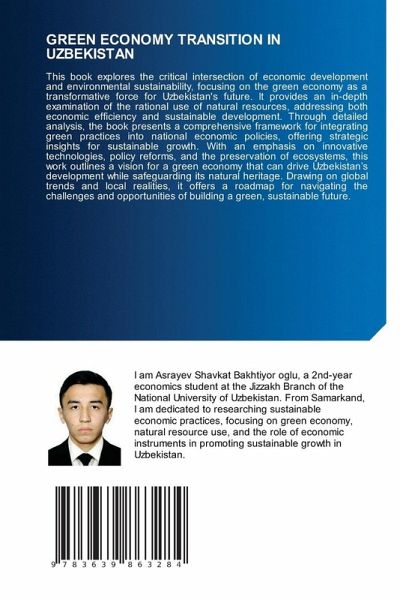 This book explores the critical intersection of economic development and environmental sustainability, focusing on the green economy as a transformative force for Uzbekistan's future. It provides an in-depth examination of the rational use of natural resources, addressing both economic efficiency and sustainable development. Through detailed analysis, the book presents a comprehensive framework for integrating green practices into national economic policies, offering strategic insights for sustainable growth. With an emphasis on innovative technologies, policy reforms, and the preservation of ecosystems, this work outlines a vision for a green economy that can drive Uzbekistan's development while safeguarding its natural heritage. Drawing on global trends and local realities, it offers a roadmap for navigating the challenges and opportunities of building a green, sustainable future.