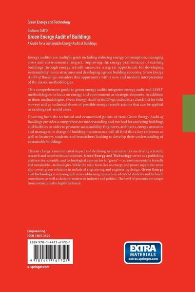 Covering both the technical and economical points of view, Green Energy Audit of Buildings provides a comprehensive understanding and method foranalyzing buildings and facilities in order to promote sustainability. Engineers, architects, energy assessors and mangers in charge of building maintenance will all find this a key reference as well as lecturers, students and researchers looking to develop their understanding of sustainable buildings.