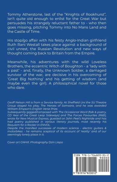 Tommy Atherstone, last of the "Knights of Rookhurst", isn't quite old enough to enlist for the Great War but persuades his strangely reluctant father to - who then goes missing, pitching Tommy into No Mans Land and the Castle of Time. His stop/go affair with his feisty Anglo-Indian girlfriend Ruth Rani Westall takes place against a background of civil unrest, the Russian Revolution and new ways of thought coming back to Britain from the Empire. Meanwhile, his adventures with the wild Loveless Brothers, the eccentric Witch of Boughton - a 'lady with a past' - and, finally, the Unknown Soldier, a damaged survivor of the war, are decisive in his overcoming of 'Great Big Nothing' and his getting of wisdom (and maybe even the girl). A philosophical novel for those who dare.
