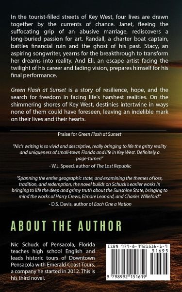 In the tourist-filled streets of Key West, four lives are drawn together by the currents of chance. Janet, fleeing the suffocating grip of an abusive marriage, rediscovers a long-buried passion for art. Randall, a charter boat captain, battles financial ruin and the ghost of his past. Stacy, an aspiring songwriter, yearns for the breakthrough to transform her dreams into reality. And Eli, an escape artist facing the twilight of his career and fading vision, prepares himself for his final performance. As their paths converge, each must confront the struggles that define them. But when a violent act threatens to shatter the fragile bonds they've forged, tragedy sets the stage for moments of unexpected triumph. Green Flash at Sunset is a story of resilience, hope, and the search for freedom in facing life's harshest realities. On the shimmering shores of Key West, destinies intertwine in ways none of them could have foreseen, leaving an indelible mark on their lives and their hearts.