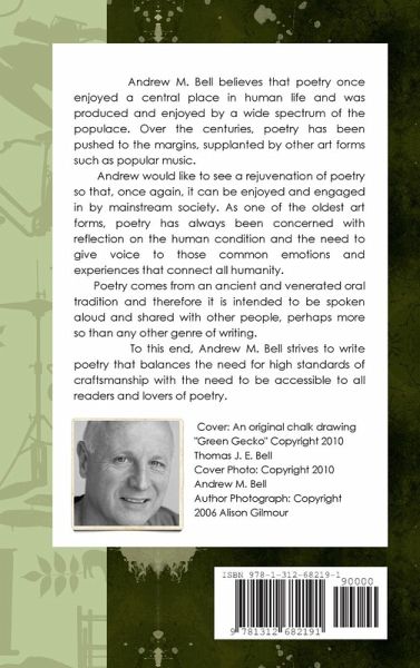 "Green Gecko Dreaming" is a collection of 62 poems written by New Zealand poet and author, Andrew M. Bell. These poems are written in a variety of styles from rhyming forms, such as the villanelle and sestina, to free verse. The poems also encompass a wide spectrum of subject matter and range in tone from the humorous to the serious. Andrew M. Bell believes in writing poetry that can be enjoyed by all readers and lovers of poetry.