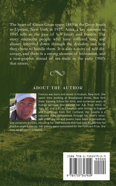 The heart of Green Grass spans 1885 in the Deep South to Upstate, New York in 1927. Anna, a key narrator in 1945 tells us the past of her family and friends. The story intersects people who have suffered loss, and abuses inherited down through the decades, and how they chose to handle them. It is also a story of self-discovery, and there is a strong element of lesbianism, and a non-graphic thread of sex-trade in the early 1900's that enters. This novella tells the story of a family's trauma and a town's shame through the eyes of the narrator Anna.