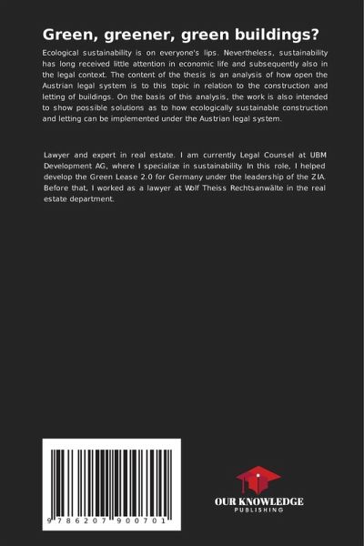 Ecological sustainability is on everyone's lips. Nevertheless, sustainability has long received little attention in economic life and subsequently also in the legal context. The content of the thesis is an analysis of how open the Austrian legal system is to this topic in relation to the construction and letting of buildings. On the basis of this analysis, the work is also intended to show possible solutions as to how ecologically sustainable construction and letting can be implemented under the Austrian legal system.