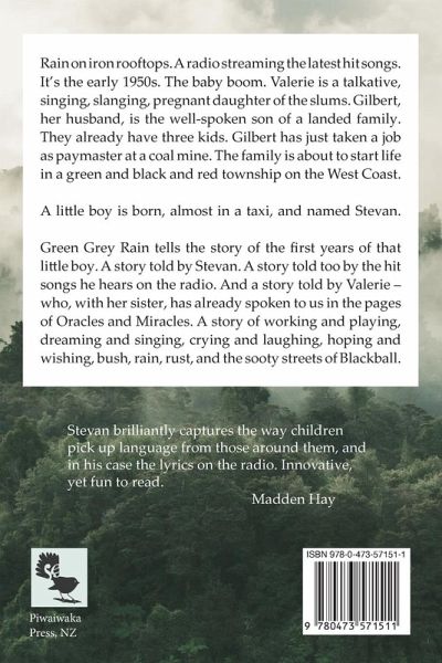 Rain on iron rooftops. A radio streaming the latest hit songs. It's the early 1950s. The baby boom. Valarie is a talkative, singing, slanging, pregnant daughter of the slums. Gilbert, her husband, is a well-spoken son of a landed family. They already have three kids. Gilbert has just taken a job as paymaster at a coal mine. The family is about to start life in a green and black and red township on the West Coast. A little boy is born, almost in a taxi, and named Stevan. Green Grey rain tells the story of the first years of a little boy dreaming and singing, wondering and wishing, in the bush, rain, rust and sooty streets of 1950s Blackball. A story told by the boy. A story told too by the hit songs he hears on the radio. And a story told by his mother - someone who, with her sister, has already spoken to us in the pages of Oracles and Miracles. Stevan is one of New Zealand's most prolific writers with 24 books published (including histories, novels, and true tales) and numerous articles, essays, and short stories. He is an award-winning author, a best-selling author, yet still a humble and engaging author.
