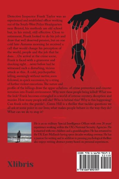 Detective Inspector Frank Taylor was an experienced and established officer working out of the South-West Police Headquarters near Bristol, his methods are old school but, in his mind, still effective. Close to retirement, Frank looked to do his job and draw that well deserved pension, but on one cold late-Autumn morning he received a call that would change his perception of the world, people and the job that he does....On arrival at the crime scene, Frank is faced with a gruesome and shocking sight....never before had he witnessed such a disturbing, vicious attack as this. A cold, psychopathic killing, seemingly without motive, soon followed, in quick succession, by a string of further violent executions. The nature and profile of the killings draw the upper echelons of crime prevention and counter terrorism into Frank's environment. Why were these people being killed? What was the link? Frank becomes entangled in a world of intense mystery, deception and murder. How many people will die? Who is behind this? Why is this happening? Can frank solve the puzzle?...Green Hill is a thriller that tackles questions we all ask at some point in our lives; what makes people behave in the way they do? What can we do to stop it?