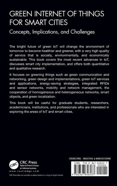 Chapter 1. Green-IoT (G-IoT): Technological Need for Sustainable Development and Smart World. Chapter 2. Green Internet of Things (G-IoT): A Solution for Sustainable Technological Development. Chapter 3. Green-IoT (G-IoT) Architectures and Their Applications in the Smart City. Chapter 4. Practical Implications of Green Internet of Things (G-IoT) for Smart Cities. Chapter 5. Green I-T and Big Data: Succeeding towards Building Smart Cities. Chapter 6. Green Internet of Things (G-IoT) Applications: AI Based Smart Farming. Chapter 7. Efficient Green Solution for a Balanced Energy Consumption and Delay in the IoT-Fog-Cloud Computing. Chapter 8. Mobility Management in Green IoT. Chapter 9. Social Distance Monitoring in Smart Cities using IoT. Chapter 10. Sustainable Solution for Load Forcasted EHV Charging Station in Smart Cities. Chapter 11. Disputes and Challenges in IoT (Internet of Things) Applications: A Literature Survey. Chapter 12. Security and Privacy for a Green Internet of Things. Chapter 13. Anomaly Detection over SDN Using Machine Learning and Deep Learning for Securing Smart City. Chapter 14. Edge AI with Wearable IoT: A Review on Leveraging Edge Intelligence in Wearables for Smart Healthcare. Chapter 15. An Approach to IoT Framework and Implementation of DoS Attack. Chapter 16. WSN Based Efficient Multi-Metric Routing for Iot Networks. Chapter 17. Green Cloud Computing: A Step Towards Environment Sustainability Using Live Virtual Machine Migration. Chapter 18. Smart Education Technology: Design Research of Future Formal Learning Environment in Smart Cities.