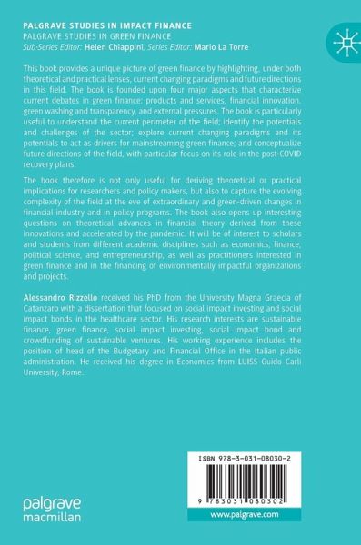 This book provides a unique picture of green finance by highlighting, under both theoretical and practical lenses, current changing paradigms and future directions in this field. The book is founded upon four major aspects that characterize current debates in green finance: products and services, financial innovation, green washing and transparency, and external pressures. The book is particularly useful to understand the current perimeter of the field; identify the potentials and challenges of the sector; explore current changing paradigms and its potentials to act as drivers for mainstreaming green finance; and conceptualize future directions of the field, with particular focus on its role in the post-COVID recovery plans.