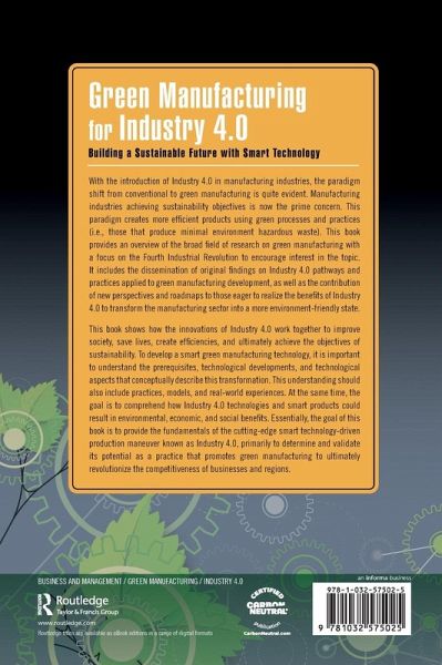 This book shows how the innovations of Industry 4.0 work together to improve society, save lives, create efficiencies, and ultimately achieve the objectives of sustainability. To develop a smart green manufacturing technology, it is important to understand the prerequisites, technological developments, and technological aspects that conceptually describe this transformation. This understanding should also include practices, models, and real-world experiences. At the same time, the goal is to comprehend how Industry 4.0 technologies and smart products could result in environmental, economic, and social benefits. Essentially, the goal of this book is to provide the fundamentals of the cutting-edge smart technology-driven production maneuver known as Industry 4.0, primarily to determine and validate its potential as a practice that promotes green manufacturing to ultimately revolutionize the competitiveness of businesses and regions.