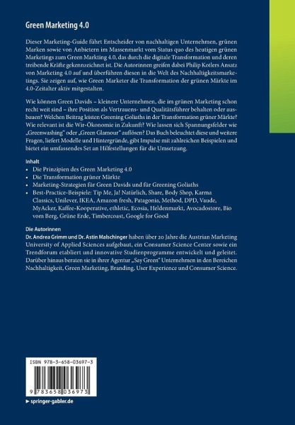 Wie können Green Davids ihre Position als Vertrauens- und Qualitätsführer behalten oder ausbauen? Welchen Beitrag leisten Greening Goliaths in der Transformation grüner Märkte? Wie relevant ist die Wir-Ökonomie in Zukunft? Wie lassen sich Spannungsfelder wie "Greenwashing" oder "Green Glamour" lösen? Das Buch beleuchtet diese und weitere Fragen, liefert Modelle und Hintergründe, gibt Impulse mit zahlreichen Beispielen und bietet ein umfassendes Set an Essentials für die Umsetzung.