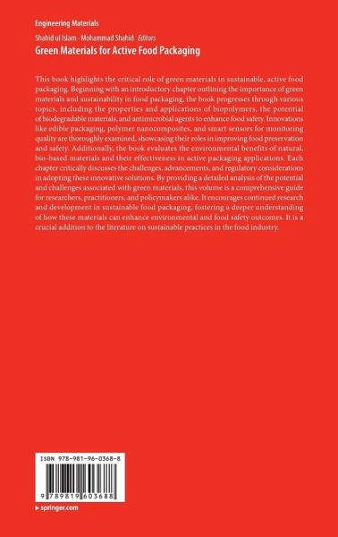 This book highlights the critical role of green materials in sustainable, active food packaging. Beginning with an introductory chapter outlining the importance of green materials and sustainability in food packaging, the book progresses through various topics, including the properties and applications of biopolymers, the potential of biodegradable materials, and antimicrobial agents to enhance food safety. Innovations like edible packaging, polymer nanocomposites, and smart sensors for monitoring quality are thoroughly examined, showcasing their roles in improving food preservation and safety. Additionally, the book evaluates the environmental benefits of natural, bio-based materials and their effectiveness in active packaging applications. Each chapter critically discusses the challenges, advancements, and regulatory considerations in adopting these innovative solutions. By providing a detailed analysis of the potential and challenges associated with green materials, this volume is a comprehensive guide for researchers, practitioners, and policymakers alike. It encourages continued research and development in sustainable food packaging, fostering a deeper understanding of how these materials can enhance environmental and food safety outcomes. It is a crucial addition to the literature on sustainable practices in the food industry.