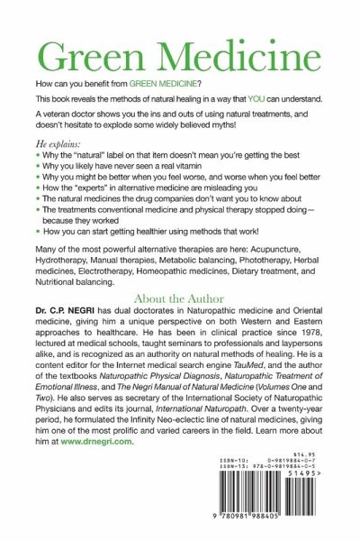 How can you benefit from GREEN MEDICINE? This book reveals the methods of natural healing in a way that YOU can understand. A veteran doctor shows you the ins and outs of using natural treatments, and doesn't hesitate to explode some widely believed myths! He explains: · Why the "natural" label on that item doesn't mean you're getting the best · Why you likely have never seen a real vitamin · Why you might be better when you feel worse, and worse when you feel better · How the "experts" in alternative medicine are misleading you · The natural medicines the drug companies don't want you to know about · The treatments conventional medicine and physical therapy stopped doing-because they worked · How you can start getting healthier using methods that work!