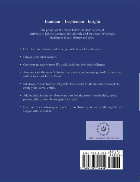 Intuition, inspiration, insight! This is an astrological moon journal based on the eight phases of each moon cycle during 2021. The last moon cycle of 2020 is included so you can work with the journal before the new year begins! Create intuitive journal entries for each phase this year, using your own natal astrological chart (not included), with a basic keyword system based on the moon phase, astrological sign, and astrological house that the degree of each phase is placed in your natal chart. You can also use this as a stand-alone journal without your natal chart. Each phase of the moon's…mehr