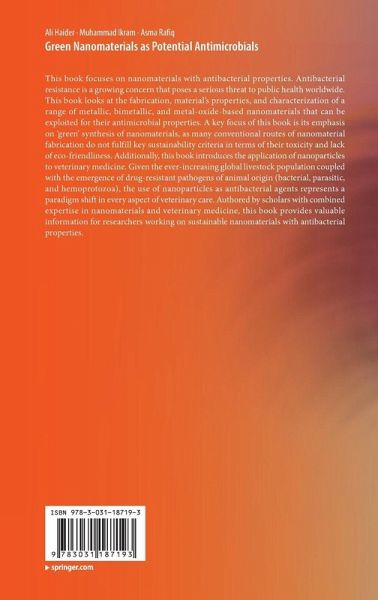 This book focuses on nanomaterials with antibacterial properties. Antibacterial resistance is a growing concern that poses a serious threat to public health worldwide. This book looks at the fabrication, material's properties, and characterization of a range of metallic, bimetallic, and metal-oxide-based nanomaterials that can be exploited for their antimicrobial properties. A key focus of this book is its emphasis on 'green' synthesis of nanomaterials, as many conventional routes of nanomaterial fabrication do not fulfill key sustainability criteria in terms of their toxicity and lack of eco-friendliness. Additionally, this book introduces the application of nanoparticles to veterinary medicine. Given the ever-increasing global livestock population coupled with the emergence of drug-resistant pathogens of animal origin (bacterial, parasitic, and hemoprotozoa), the use of nanoparticles as antibacterial agents represents a paradigm shift in every aspect of veterinary care. Authored by scholars with combined expertise in nanomaterials and veterinary medicine, this book provides valuable information for researchers working on sustainable nanomaterials with antibacterial properties.