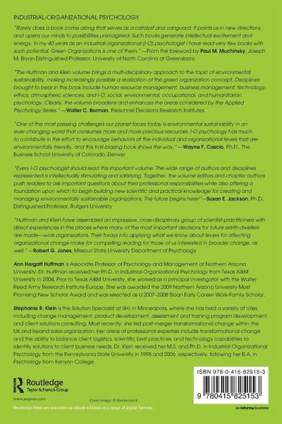 This book is a landmark in showing how industrial-organizational psychology and related fields contribute to environmental sustainability in organizations. Industrial-organizational psychology embraces a scientist/practitioner model: evidence-based best practice to solve real-world issues.