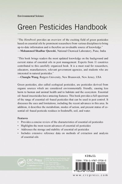 Green pesticides, also called ecological pesticides, are pesticides derived from organic sources which are considered environmentally friendly and are causing less harm to human and animal health and to habitats and the ecosystem. Essential oils based insecticides started have amazing features. This book gives a full spectrum of the whole range of essential oil based pesticides that may be used in pest control. It discusses the uses and limitations, including the recent advances in this area. It describes the metabolism and mode of action, and provides the present status of essential oil based pesticide residues in foodstuffs, soil and water.