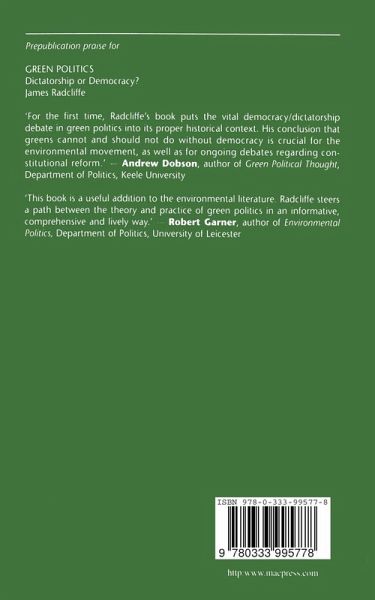 At the heart of the green debate are a set of basic contradictions concerning beliefs and actions. This book reveals the problems associated with these contradictions, including adherence to decentralized political forms while accepting authoritarian intervention on behalf of the environment; a belief that this is the politics of the new age but in practice split between left and right; a rejection of the rationalist scientific project and a reliance on the lessons of the science of ecology.