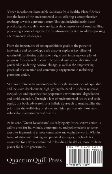 "Green Revolution: Sustainable Solutions for a Healthy Planet" delves into the heart of the environmental crisis, offering a comprehensive roadmap towards a greener future. Through insightful analysis and practical guidance, this book navigates the complexities of sustainability, presenting a compelling case for transformative action to address pressing environmental challenges. From the importance of setting ambitious goals to the power of innovation and technology, each chapter explores key pillars of sustainability, offering actionable insights and inspiring examples of progress. Readers will discover the pivotal role of collaboration and partnership in driving positive change, as well as the empowering potential of education and community engagement in mobilizing grassroots action. Moreover, "Green Revolution" emphasizes the importance of equitable and inclusive development, highlighting the need to address systemic inequalities and injustices that perpetuate environmental degradation and social exclusion. Through a lens of environmental justice and social equity, this book advocates for a holistic approach to sustainability that prioritizes the well-being of all communities, particularly those most vulnerable to environmental hazards. At its core, "Green Revolution" is a rallying cry for collective action-a call to arms for individuals, communities, and policymakers to come together in pursuit of a more sustainable and equitable world. With its blend of visionary thinking and practical strategies, this book is a must-read for anyone committed to building a healthier, more resilient planet for future generations.