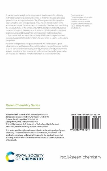 There is a trend in analytical chemistry towards development of eco-friendly methods of sample preparation without loss of efficiency. This book provides a general, critical, and updated vision of the different green sample preparation approaches that have been developed. These include miniaturisation of the extraction techniques that allow a reduction not only of the chemicals used during the process, but also of the sample amount; the use of greener solvents, such as certain ionic liquids (ILs) or deep eutectic solvents (DES), instead of conventional organic solvents; and the use of new selective sorbent materials that allow both extraction and clean-up in the same step. All of these strategies have been successfully applied to the determination of a wide variety of organic and inorganic compounds. Advanced undergraduate and graduate students will find this book a good reference source and, because of the multidisciplinary nature of this topic, it will be of use to a broad audience including chemists, materials scientists, environmental analysts, forensic scientists, pharmacists, biologists and chemical engineers, who are involved and interested in the future frontiers of analytical chemistry.