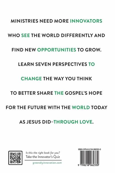 The right perspective can change everything. The world is accelerating, but your ministry doesn't need to fall behind. Learn to see from an innovator's point of view. Challenges become opportunities, failures move you forward, and organizational cultures transform from timid to uninhibited. In this powerful debut, Liam Savage reveals seven perspectives of a kingdom innovator and how to apply them to your ministry. Discover some of the best thinking from fields including technology design, marketing, systems thinking, entrepreneurship, and cross-cultural leadership that can transform your ministry approach. Green Sky Innovation removes the guesswork and shows how simple innovating can be. Learn to create user journeys, prototypes, compelling product stories, and collaborative experiences that will unlock your team's creativity and multiply your kingdom effectiveness. You can make the future. First, you just need the right perspective.