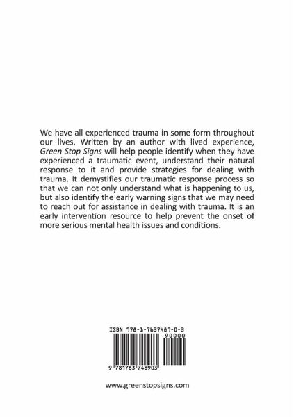 We have all experienced trauma in some form throughout our lives. Written by an author with lived experience, Green Stop Signs will help people identify when they have experienced a traumatic event, understand their natural response to it and provide strategies for dealing with trauma. It demystifies our traumatic response process so that we can not only understand what is happening to us, but also identify the early warning signs that we may need to reach out for assistance in dealing with trauma. It is an early inter intervention resource to help prevent to onset of more serious mental health issues and conditions.