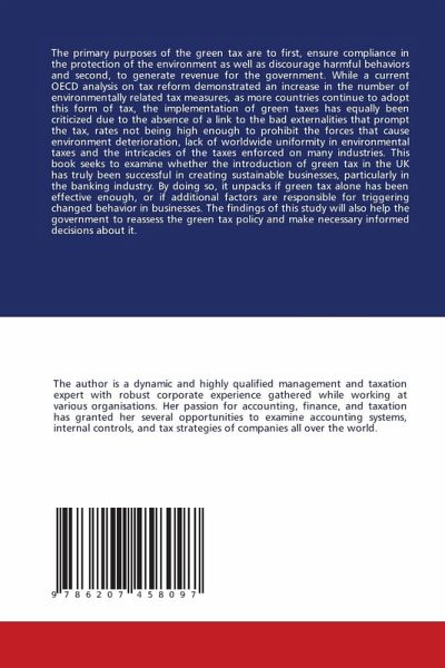 The primary purposes of the green tax are to first, ensure compliance in the protection of the environment as well as discourage harmful behaviors and second, to generate revenue for the government. While a current OECD analysis on tax reform demonstrated an increase in the number of environmentally related tax measures, as more countries continue to adopt this form of tax, the implementation of green taxes has equally been criticized due to the absence of a link to the bad externalities that prompt the tax, rates not being high enough to prohibit the forces that cause environment deterioration, lack of worldwide uniformity in environmental taxes and the intricacies of the taxes enforced on many industries. This book seeks to examine whether the introduction of green tax in the UK has truly been successful in creating sustainable businesses, particularly in the banking industry. By doing so, it unpacks if green tax alone has been effective enough, or if additional factors are responsible for triggering changed behavior in businesses. The findings of this study will also help the government to reassess the green tax policy and make necessary informed decisions about it.