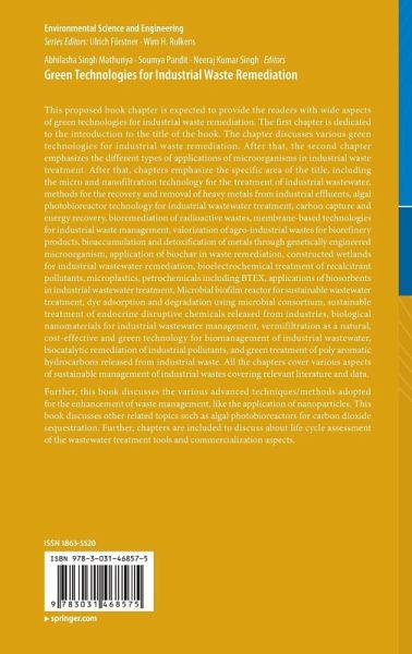 1. Application of Microorganisms in Industrial Waste Treatment.- 2. An Overview Of Fungi And Nanomaterial-Based Technologies for The Treatment Of Industrial Effluents.- 3. Hazardous Effects of Heavy Metals from Industrial Wastewaters and Their Remediation Through Green Technology.- 4. Algal Photo bioreactors: A promising technology for wastewater treatment.- 5. Membrane based technologies for industrial waste management.- 6. Valorization of Agro-Industrial Wastes for Biorefinery Products.- 7. A Critical Assessment Of Processes And Products For Valorization Of Agroforestry Industrial Wastes For Biorefinery.- 8. Bioaccumulation and detoxification of metals through Genetically Engineered Microorganism.- 9. Constructed wetlands for industrial wastewater remediation.- 10. Bioelectrochemical Treatment of Petrochemicals.- 11. Biogenic Nanomaterials: Synthesis, Characterization and its Potential in Dye Remediation.- 12. Biocatalytic Remediation Of Industrial Pollutants.- 13. Photocatalytic Treatment of Wastewater.- 14. Microbial Biofilm Reactor for Sustainable Wastewater Treatment.