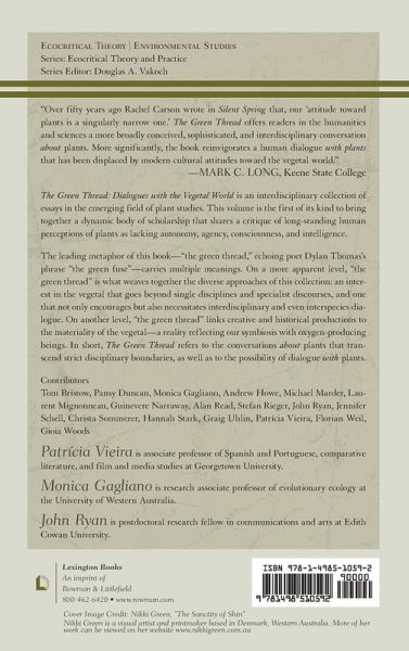 The Green Thread: Dialogues with the Vegetal World is an interdisciplinary collection of essays in the emerging field of Plant Studies. The volume is the first of its kind to bring together a dynamic body of scholarship that shares a critique of long-standing human perceptions of plants as lacking autonomy, agency, consciousness, and, intelligence. The leading metaphor of the book—"the green thread", echoing poet Dylan Thomas’ phrase "the green fuse"—carries multiple meanings. On a more apparent level, "the green thread" is what weaves together the diverse approaches of this collection: an interest in the vegetal that goes beyond single disciplines and specialist discourses, and one that not only encourages but necessitates interdisciplinary and even interspecies dialogue. On another level, "the green thread" links creative and historical productions to the materiality of the vegetal—a reality reflecting our symbiosis with oxygen-producing beings. In short, The Green Thread refers to the conversations about plants that transcend strict disciplinary boundaries as well as to the possibility of dialogue with plants.