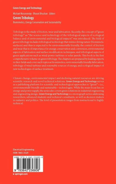 Introduction.- Part One: Biomimetics.- Biomimetic surfaces: an overview.- Lotus effect for non-adhesive surfaces.- Friction in living nature.- Biomimetic microstructured surfaces for dry friction.- Self-lubrication in nature and engineering.- Gecko-effect.- Surface-healing composite materials.- Self-replenishing lubrication.- Part Two: Control of Friction and Wear.- Surface texturing for friction and wear control.- Solid lubrication.- Self-organization during friction.- Part Three: Environmental Aspects of Lubrication and Surface Modification.- Environmentally-friendly lubricants: biodegradable and non-toxic.- Environmental aspects of the Lotus effect and surface microstructuring.- Self-cleaning polymeric surfaces.- Self-cleaning metallic surfaces.- Antifouling surfaces: environmental aspects.- Part Four: Green Applications.- Tribology of wind power turbines.- Self-cleaning solar panel coatings.- Surface modification and new ways of energy transition.- Closure.