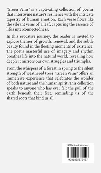 "Green Veins" is a captivating collection of poems that intertwine nature's resilience with the intricate tapestry of human emotion. Each verse flows like the vibrant veins of a leaf, capturing the essence of life's interconnectedness. In this evocative journey, the reader is invited to explore themes of growth, renewal, and the subtle beauty found in the fleeting moments of existence. The poet's masterful use of imagery and rhythm breathes life into the natural world, revealing how deeply it mirrors our own struggles and triumphs. From the whispers of a forest in spring to the silent strength of weathered trees, "Green Veins" offers an immersive experience that celebrates the wonder of both nature and the human spirit. This collection speaks to anyone who has ever felt the pull of the earth beneath their feet, reminding us of the shared roots that bind us all.