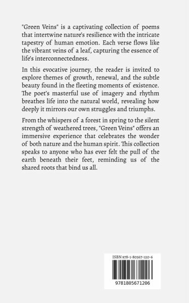 "Green Veins" is a captivating collection of poems that intertwine nature's resilience with the intricate tapestry of human emotion. Each verse flows like the vibrant veins of a leaf, capturing the essence of life's interconnectedness. In this evocative journey, the reader is invited to explore themes of growth, renewal, and the subtle beauty found in the fleeting moments of existence. The poet's masterful use of imagery and rhythm breathes life into the natural world, revealing how deeply it mirrors our own struggles and triumphs. From the whispers of a forest in spring to the silent strength of weathered trees, "Green Veins" offers an immersive experience that celebrates the wonder of both nature and the human spirit. This collection speaks to anyone who has ever felt the pull of the earth beneath their feet, reminding us of the shared roots that bind us all.