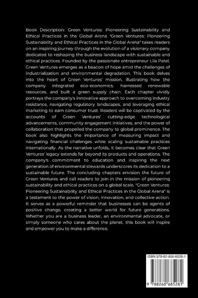 Green Ventures: Pioneering Sustainability and Ethical Practices in the Global Arena "Green Ventures: Pioneering Sustainability and Ethical Practices in the Global Arena" takes readers on an inspiring journey through the evolution of a visionary company dedicated to reshaping the business landscape with sustainable and ethical practices. Founded by the passionate entrepreneur Lila Patel, Green Ventures emerges as a beacon of hope amid the challenges of industrialization and environmental degradation. This book delves into the heart of Green Ventures' mission, illustrating how the company integrated eco-economics, harnessed renewable resources, and built a green supply chain. Each chapter vividly portrays the company's innovative approach to overcoming industry resistance, navigating regulatory landscapes, and leveraging ethical marketing to earn consumer trust. Readers will be captivated by the accounts of Green Ventures' cutting-edge technological advancements, community engagement initiatives, and the power of collaboration that propelled the company to global prominence. The book also highlights the importance of measuring impact and navigating financial challenges while scaling sustainable practices internationally. As the narrative unfolds, it becomes clear that Green Ventures' legacy extends far beyond its products and operations. The company's commitment to education and inspiring the next generation of environmental stewards underscores its dedication to a sustainable future. The concluding chapters envision the future of Green Ventures and call readers to join in the mission of pioneering sustainability and ethical practices on a global scale. "Green Ventures: Pioneering Sustainability and Ethical Practices in the Global Arena" is a testament to the power of vision, innovation, and collective action. It serves as a powerful reminder that businesses can be agents of positive change, creating a better world for future generations. Whether you are a business leader, an environmental advocate, or simply someone who cares about the planet, this book will inspire and empower you to make a difference.