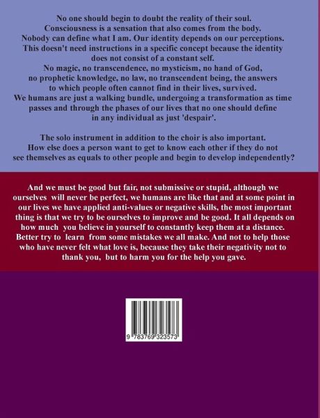 No one should begin to doubt the reality of their soul. Consciousness is a sensation that also comes from the body. Nobody can define what I am. Our identity depends on our perceptions. This doesn't need instructions in a specific concept because the identity does not consist of a constant self. No magic, no transcendence, no mysticism, no hand of God, no prophetic knowledge, no law, no transcendent being, the answers to which people often cannot find in their lives, survived. We humans are just a walking bundle, undergoing a transformation as time passes and through the phases of our lives that no one should define in any individual as just 'despair'. The solo instrument in addition to the choir is also important. How else does a person want to get to know each other if they do not see themselves as equals to other people and begin to develop independently?