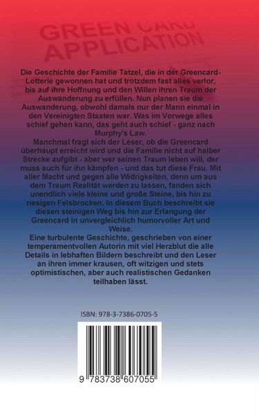 Die Geschichte der Familie Tatzel, die in der Greencard-Lotterie gewonnen hat und trotzdem fast alles verlor, bis auf ihre Hoffnung und den Willen ihren Traum der Auswanderung zu erfüllen. Nun planen sie die Auswanderung, obwohl damals nur der Mann einmal in den Vereinigten Staaten war.Was im Vorwege alles schief gehen kann, das geht auch schief - ganz nach Murphy's Law. Manchmal fragt sich der Leser, ob die Greencard überhaupt erreicht wird und die Familie nicht auf halber Strecke aufgibt - aber wer seinen Traum leben will, der muss auch für ihn kämpfen - und das tut diese Frau. Mit aller Macht und gegen alle Widrigkeiten. Doch dann begann erst der wahre Kampf um ihren Traum - denn um aus dem Traum Realität werden zu lassen fanden sich unendlich viele kleine und große Steine bis hin zu riesigen Felsbrocken auf dem Weg dorthin.In diesem Buch beschreibt sie diesen steinigen Weg bis hin zur Erlangung der Greencard in unvergleichlich humorvoller Art und Weise.Eine turbulente Geschichte, geschrieben von einer temperamentvollen Autorin mit viel Herzblut, die alle Details in lebhaften Bildern beschreibt und den Leser an ihren immer krausen, oft witzigen und stets optimistischen, aber auch realistischen Gedanken teilhaben lässt.