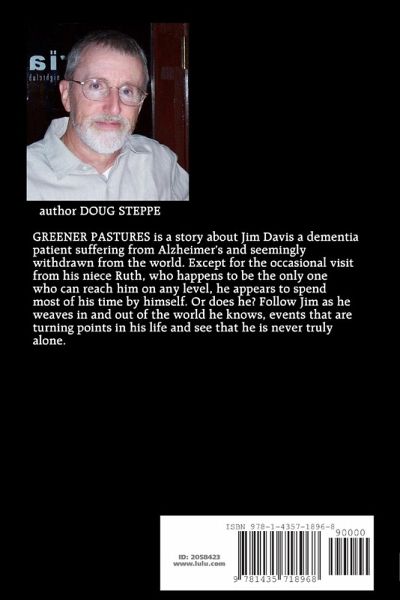GREENER PASTURES is a story of Jim Davis a dementia patient suffering from Alzheimer's and seemingly withdrawn from the world. Except for the occasional visit from his niece Ruth, who happens to be the only one who can reach him on any level, he appears to spend most of his time by himself. Or does he? Follow Jim as he weaves in and out of the world he knows, events that are turning points in his life and see that he is never truly alone.