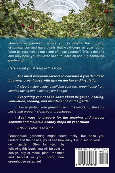 The Ultimate Guide to Starting Your First Greenhouse Garden Do you want to be able to grow your own food all year round? Have you always wanted to have a greenhouse garden but were not sure where to start? Yes? Well, this is just the book for you! Gardening is not only beautiful but also a very useful hobby. Nothing quite feels you up with a sense of pride like when you see your first plants growing and thriving. And just imagine picking up fresh tomatoes and having them for dinner! Certified organic and delicious, straight from your very own garden. Greenhouse gardening allows you to control the growing circumstances and have plants that yield crops all year round. Want to know how to build one of those yourself? This is the one and only book you will ever need to learn all about greenhouse gardening! Here's what you'll learn in this book:The most important factors to consider if you decide to buy your greenhouse with tips on design and insulation A step-by-step guide to building your own greenhouse from scratch taking into account your budget Everything you need to know about irrigation, heating, ventilation, feeding, and maintenance of the garden How to protect your greenhouse in the longterm, stave off pests and properly clean your greenhouse Best ways to prepare for the growing and harvest seasons and maintain healthy crops all year round AND SO MUCH MORE!