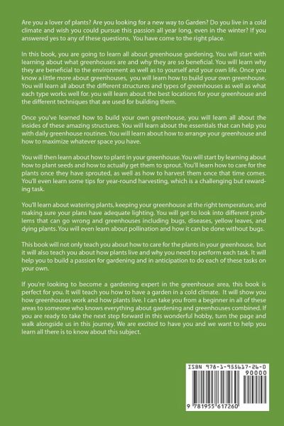 Are you a lover of plants? Are you looking for a new way to garden? Do you live in a cold climate and wish that you could pursue this passion all year long, even in the winter? If you answered yes to any of these questions, you've come to the right place! In this book, Greenhouse Gardening, you'll start by learning about what greenhouses are and why they're so beneficial to the environment, as well as to yourself and your own life. Once you know a little more about greenhouses, you'll learn how to build your own greenhouse. You'll learn all about the different structures and types of greenhouses, as well as what each type works well for. You'll learn about the best locations for your greenhouse and the different techniques that are used for building them... Once you've learned how to build your own greenhouse, you'll learn all about the insides of these amazing structures. You'll learn about the essentials that can help you with daily greenhouse routines. You'll learn about how to arrange your greenhouse and how to maximize whatever space you have... You'll then learn about how to plant in your greenhouse. You'll start by learning about how to plant seeds and how to actually get them to sprout. You'll learn how to care for the plants once they've sprouted, as well as how to harvest them once that time comes. You'll even learn tips for year-round harvesting, which is a challenging but rewarding task... You'll learn about watering plants, keeping your greenhouse at the right temperature, and making sure your plants have adequate lighting. You'll get to look into different problems that can go wrong in greenhouses including bugs, diseases, yellow leaves, and dying plants. You'll also learn about pollination and how it can be done without bugs... This book will not only teach you about how to care for the plants in your greenhouse, but it will also teach you about how plants live and why you need to perform each task. It will help you to build a passion for gardening and in anticipation to do each of these tasks on your own... If you're looking to become a gardening expert in the greenhouse area, then this book is perfect for you. It will teach you how to have a garden in a cold climate. It will show you how greenhouses work and how plants live. It can take you from a beginner in all of these areas to someone who knows everything about gardening and greenhouses combined. If you are ready to take the next step forward in this wonderful hobby, get this book and start your Greenhouse Gardening journey today! Grab your copy of Greenhouse Gardening now!