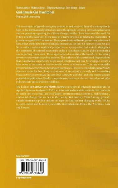 Benefits of dealing with uncertainty in greenhouse gas inventories: introduction.- Statistical dependence in input data of national greenhouse gas inventories: effects on the overall inventory uncertainty.- Uncertainty analysis for estimation of landfill emissions and data sensitivity for the input variation.- Toward Bayesian uncertainty quantification for forestry models used in the United Kingdom Greenhouse Gas Inventory for land use, land use change, and forestry.- Atmospheric inversions for estimating CO2 fluxes: methods and perspectives.- European CO2 fluxes from atmospheric inversions using regional and global transport models.- Remotely sensed soil moisture integration in an ecosystem carbon flux model. The spatial implication.- Can the uncertainty of full carbon accounting of forest ecosystems be made acceptable to policymakers?.- Terrestrial full carbon account for Russia: revised uncertainty estimates and their role in a bottom-up/top-down accounting exercise.- Comparison ofpreparatory signal analysis techniques for consideration in the (post-)Kyoto policy process.- Verification of compliance with GHG emission targets: annex B countries.- Spatial GHG inventory at the regional level: accounting for uncertainty.- Quantitative quality assessment of the greenhouse gas inventory for agriculture in Europe.- A statistical model for spatial inventory data: a case study of N2O emissions in municipalities of southern Norway.- Carbon emission trading and carbon taxes under uncertainties.- CO2 emission trading model with trading prices.- Compliance and emission trading rules for asymmetric emission uncertainty estimates.- The impact of uncertain emission trading markets on interactive resource planning processes and international emission trading experiments.
