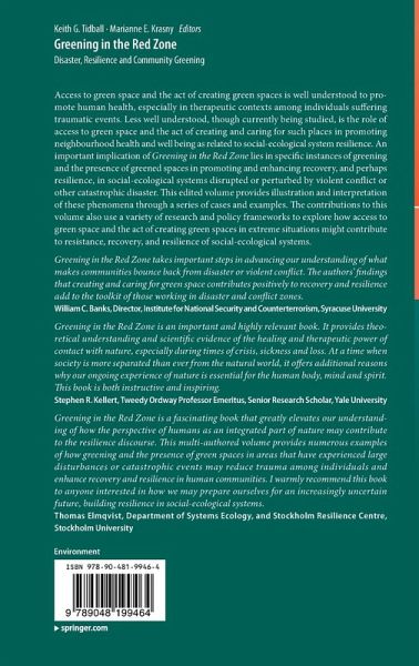 Foreword.- Preface.- PART I: Foundations.- Introduction: Greening in the Red Zone.- Resilience and Transformation in the Red Zone.- GRZ Vignette 1 - An Urban Park in Earthquake Stricken Port-au-Prince, Haiti.- PART II: Motives and Explanation.- Urgent Biophilia.- Sowing Seeds of Resilience: Community Gardening in a Post-Disaster Context.- GRZ Vignette 2 - Transforming Degraded Space into a Community Asset - The Soweto Mountain of Hope.- The Role of Nature in Children's Resilience: Cognitive and Social Processes.- Children's Engagement with the Natural World as a Ground for Healing.- GRZ Vignette 3 - 8,000 Trees - A Refuge From Ruins in Afghanistan.- Topophilia, Biophilia and Greening in the Red Zone.- Urban Gardens: Pockets of Social-Ecological Memory.- GRZ Vignette 4 - Reconstructing Village Groves After a Typhoon in Korea.- Nature Engagement to Foster Resilience in Military Communities.- Garden for Victory! The American Victory Garden Campaign of World War II.- GRZ Vignette 5 - The Korean DMZ: From Red Zone to Green Zone.- Green Zones from Above and Below: A Retrospective and Cautionary Tale.- Reflections on Defiant Gardens: Making Gardens in Wartime.- PART III: Cases & Practices.- Restoration of the Urban Forests of Tokyo and Hiroshima Following World War II.- Valuing Urban Forest: Lessons to Learn from Hurricanes.- Trees, Rebirth and Resilience: Symbol, Ritual and Resilience in Post-Katrina New Orleans.- GRZ Vignette 6 - The Risks of Greening in the Red Zone: Creating Afghanistan's First National Park in the Midst of Conflict.- Destruction and Replanting of the Urban Forest of Sarajevo, Bosnia and Herzegovina.- The Re-greening of the Grey: Some Practical Considerations for the Urban Forest.- GRZ Vignette 7 - Trees and Tree Planting in Southern Madagascar: Sacredness and Remembrance.- Community-Based Memorials to September 11, 2001: Environmental Stewardship as Memory Work.- GRZ Vignette 8 - Six Ares of Land for the Resilience of UrbanFamilies in Post-Soviet Russia.- Beyond the Bars: Landscapes for Health and Healing in Corrections.- GRZ Vignette 9 - Wildlife: The Catalyst for Peace in Northern Kenya.- Sustainability-Oriented Social Learning in Multi-Cultural Urban Areas: The Case of the Rotterdam Environmental Centre.- Developing a Safe, Nurturing and Therapeutic Environment for the Families of the Garbage Pickers in Guatemala and for Disabled Children in Bosnia and Herzegovina.- GRZ Vignette 10 - Reforestation Activities at a Chadian Refugee Camp in Northern Cameroon.- Growing Hope: How Urban Gardens are Empowering War-Affected Liberians and Harvesting a New Generation of City Farmers.- Cyprus - Greening the Dead Zone.- GRZ Vignette 11 - The Berlin Wall Trail - A Cycling and Hiking Route on the Traces of Berlin's Cold War Divide.- Synthesis and Conclusions: Applying Greening in Red Zones.- Name and Subject Index.