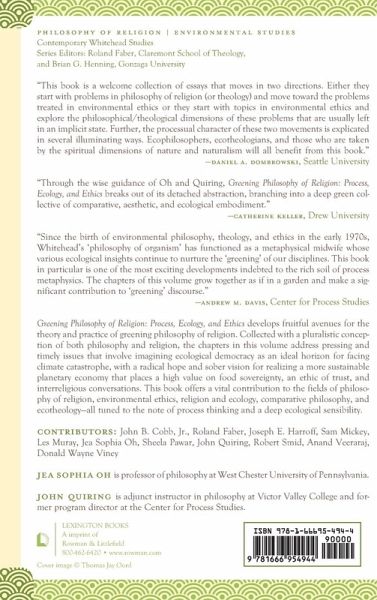Greening Philosophy of Religion: Process, Ecology, and Ethics develops fruitful avenues for the theory and practice of greening philosophy of religion. Collected with a pluralistic conception of both philosophy and religion, the chapters in this volume address pressing and timely issues that involve imagining ecological democracy as an ideal horizon for facing climate catastrophe, with a radical hope and sober vision for realizing a more sustainable planetary economy that places a high value on food sovereignty, an ethic of trust, and inter-religious conversations. Edited by Jea Sophia Oh and John Quiring, this book offers a vital contribution to the fields of philosophy of religion, environmental ethics, religion and ecology, comparative philosophy, and ecotheology-all tuned to the note of process thinking and a deep ecological sensibility.