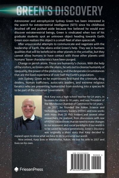 Astronomer and astrophysicist Sydney Green has been interested in the search for extraterrestrial intelligence (SETI) since his childhood. Brushed off and pushed aside because few believed he would ever discover extraterrestrial beings, Green is vindicated when two of his graduate students spot an unknown object heading towards Earth. Green soon realizes this object is a small fleet of alien spacecraft. After unsuccessful attempts to communicate and negotiate with the leadership of Earth, the aliens enlist Green's help. They see in humans qualities that will be beneficial to other planets in the universe, but they cannot allow humans to have contact with those other planets until humans' baser characteristics have been purged. Change or perish alone. Those are humanity's choices. With the help of the visitors, as Green calls the aliens, he sets out to cleanse humanity of inequality, the power of the plutocracy, and the desperate circumstances that are the lived experience of over half the Earth's population. Join Sydney Green as he experiences first-hand the criminals, drug dealers, human traffickers, autocratic leaders, and extreme religious fanatics who are preventing humankind from evolving into a species fit to be part of the Universal Government.