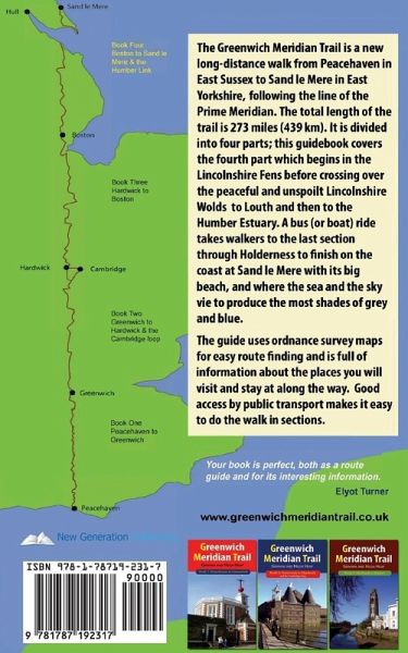 The Greenwich Meridian Trail is a new long-distance walk from Peacehaven in East Sussex to Sand le Mere in East Yorkshire, following the line of the Prime Meridian. The total length of the trail is 273 miles (439 km). It is divided into four parts, this guidebook covers the fourth part which begins in the Lincolnshire Fens before crossing over the peaceful and unspoilt Lincolnshire Wolds to Louth and then to the Humber Estuary. A bus (or boat) ride takes walkers to the last section through Holderness to finish on the coast at Sand le Mere with its big beach, and where the sea and the sky vie to produce the most shades of grey and blue. The guide uses ordnance survey maps for easy route finding and is full of information about the places you will visit and stay at along the way. Good access by public transport makes it easy to do the walk in sections.